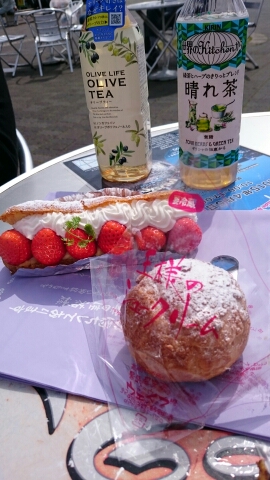 シュークリームの後ろに写ってるお茶は
